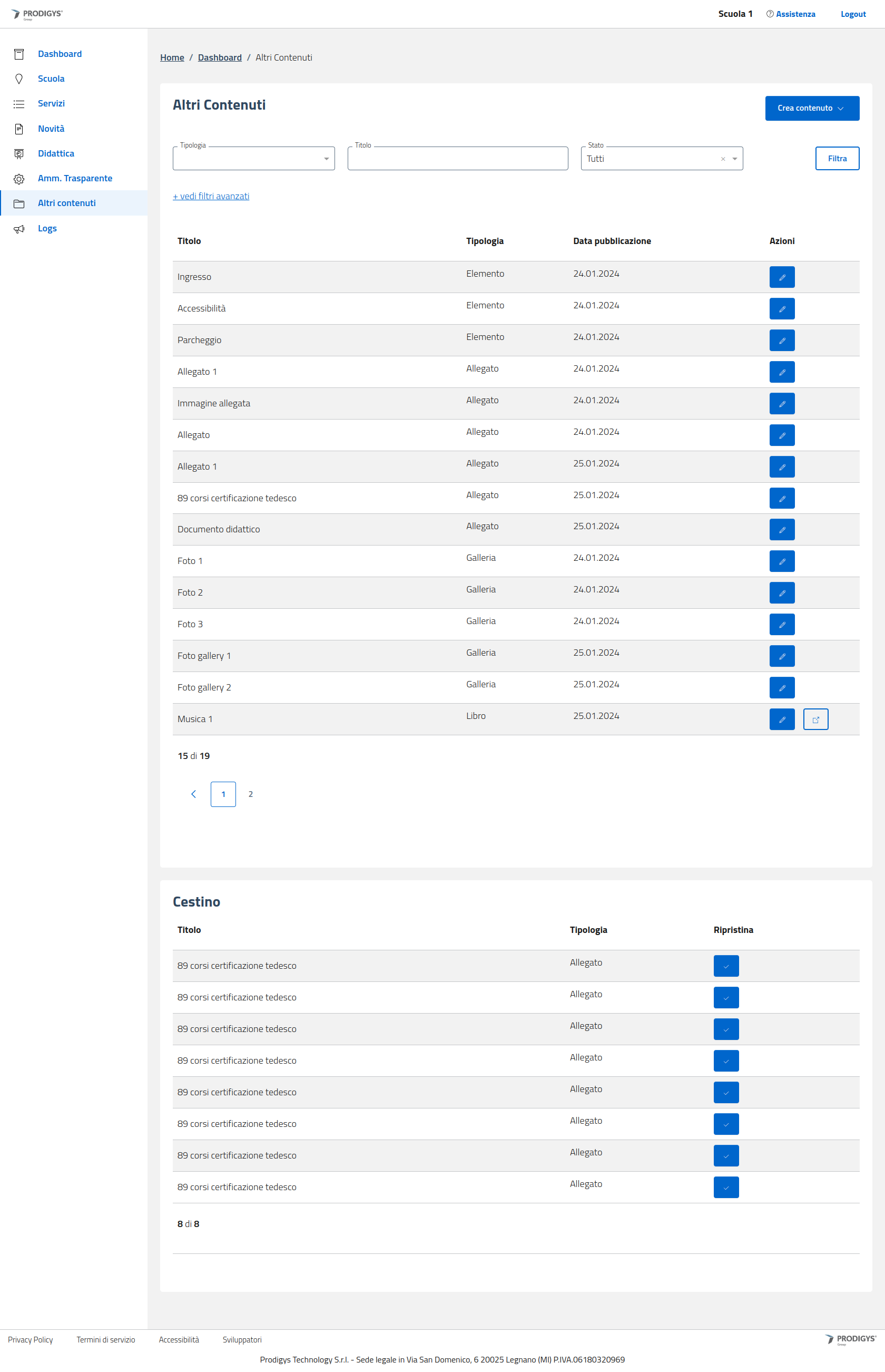 Per andare a modificare un contenuto basta premere sul bottone con l’icona della matita di fianco al elemento che si vuole andare a modificare, Dopo il click si aprirà la stessa schermata dell’inserimento già precompilata con i dati inseriti in precedenza.