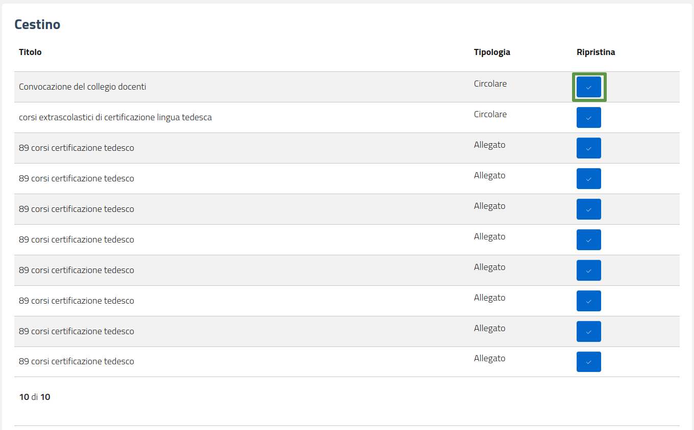 Nella sezione intitolata Cestino è possibile andare a vedere tutti gli elementi cancellati, da questo elenco è possibile andare a recuperare l’elemento tramite il bottone segnato blu nella colonna Ripristina, nella foto sottostante in corniciato in verde.