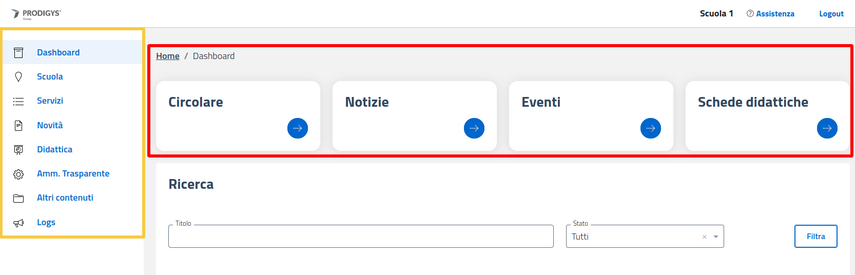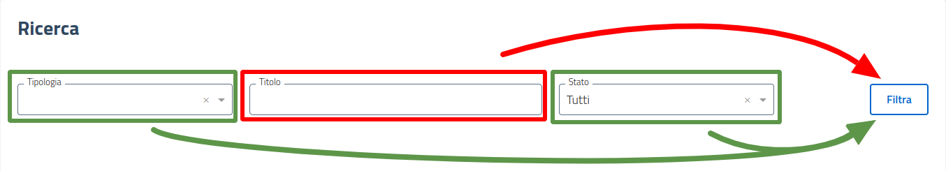 Nella sezione intitolata Ricerca è possibile andare a vedere tutti gli inserimenti fatti, è possibile quindi andare ad eseguire una ricerca in base al titolo degli elementi inserendo la parola che si vuole ricercare nel campo apposito e successivamente cliccando il tasto filtra, oppure usando il tasto invio della tastiera (Percorso in rosso).