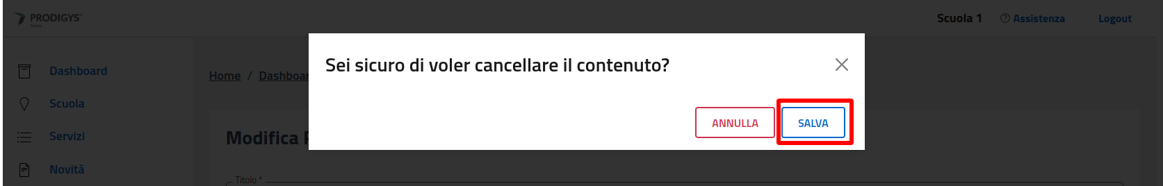 Per eliminare un elemento basterà premere il pulsante cancella segnato in rosso nella foto sopra e successivamente il pulsante Salva.
