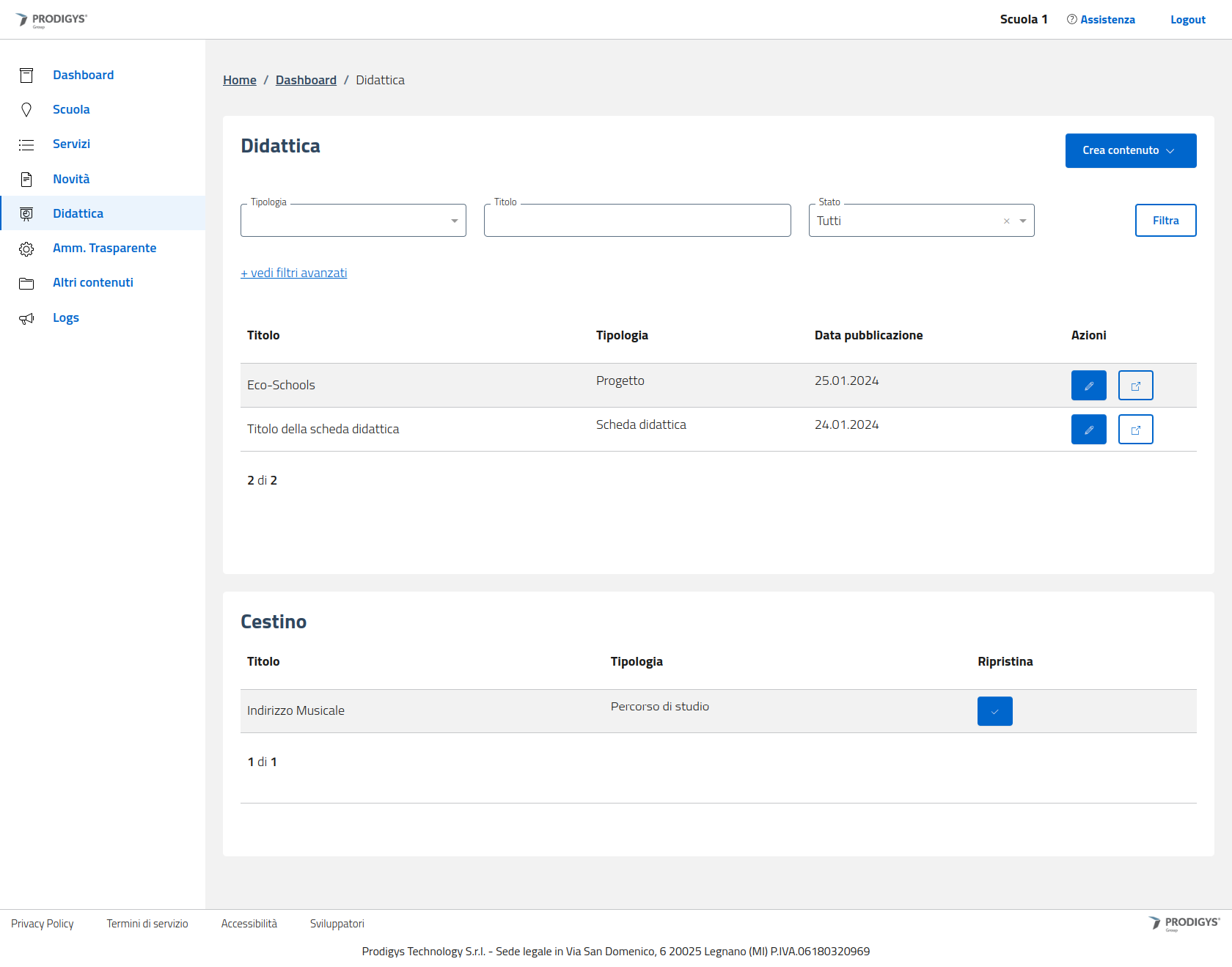 Nella sezione della didattica è possibile andare a gestire i progetti, le schede didattiche e i percorsi di studio. La gestione consiste nella creazione , la modifica o la cancellazione di uno di questi elementi. Nella schermata è inoltre possibile vedere gli elementi pubblicati e gli elementi cancellati riguardanti quella sezione.