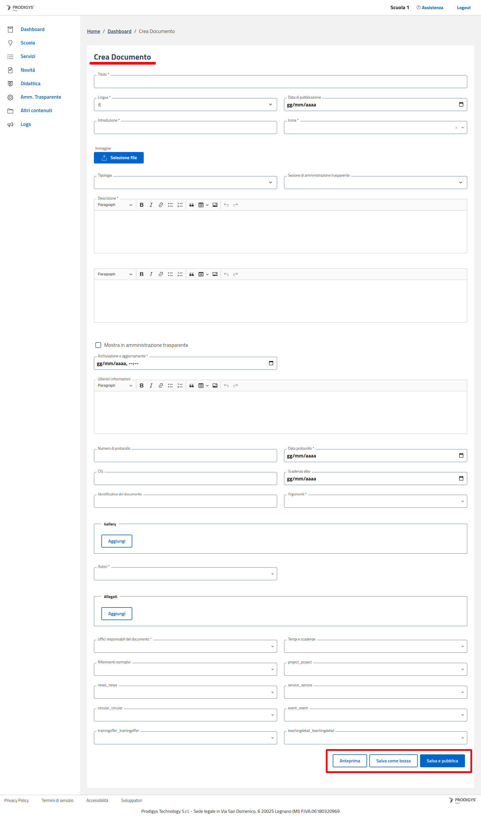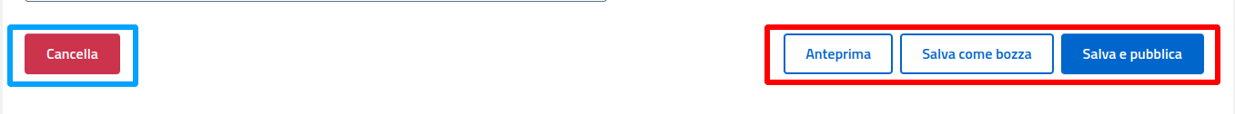 In fondo alla pagina è possibile effettuare le stesse operazioni di visualizzazione dell’anteprima, salvataggio come bozza e di salvataggio e pubblicazione.