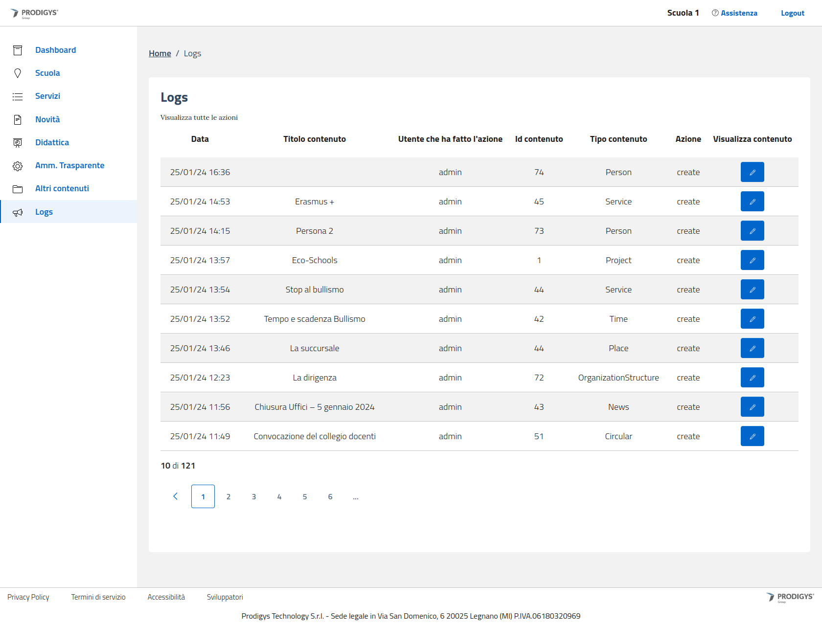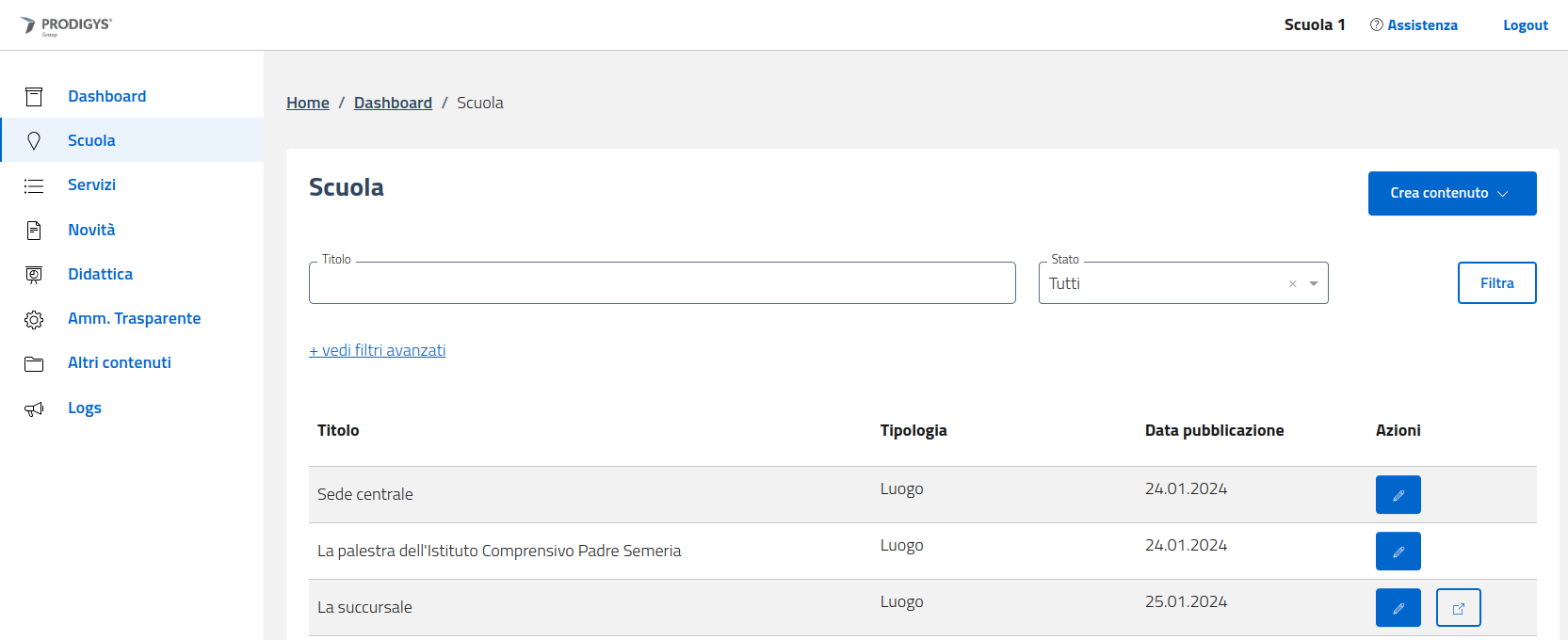 Attraverso i bottoni nel campo azioni sarà possibile andare a modificare l’inserimento tramite l’icona della matita, oppure se l’inserimento ha anche una pagina associata sarà presente anche un bottone bianco, che permetterà di andare ad aprire in una nuova schermata la pagina associata del sito web
