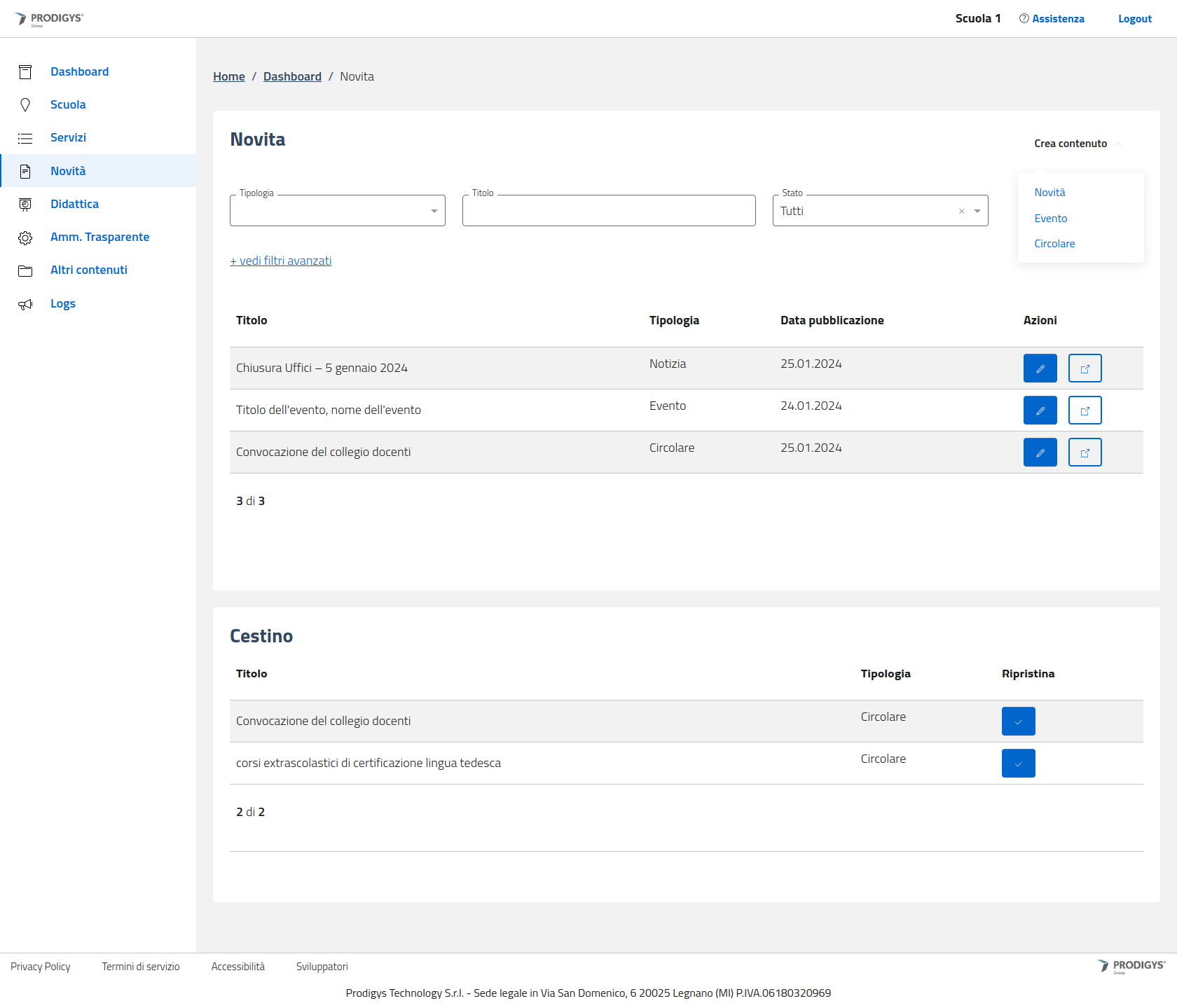 Nella sezione delle novità è possibile andare a gestire le novità, gli eventi e le circolari. All’interno della pagina è possibile vedere l’elenco delle notizie e filtrare gli elementi in base alla tipologia, al titolo e allo Stato. È possibile anche andare ad effetturare le operazioni base di creazione, modifica e cancellazione degli elementi.