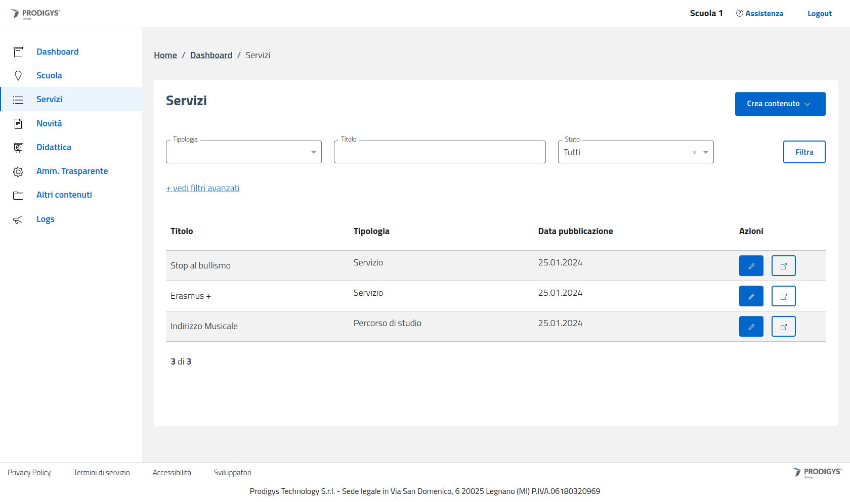 Nella sezione dei servizi è possibile andare a gestire i servizi e i percorsi di studio. In questa pagina è possibile andare a visualizzare gli elementi creati e gli elementi cancellati, inoltre è possibile creare, modificare e cancellare gli elementi della sezione.
